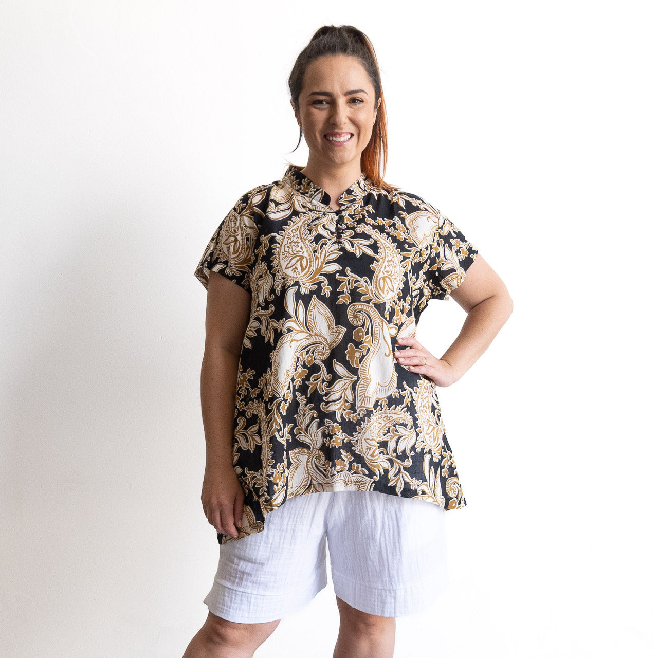 This breezy summer tunic is effortlessly paired with lounge pants, tucked into shorts or thrown on over swimwear. The mandarin collar and cap sleeves provide sun-smart coverage, while the longer hemline adds versatility. Ideal for travel, this top is quick-drying and light, perfect for steamy climates.