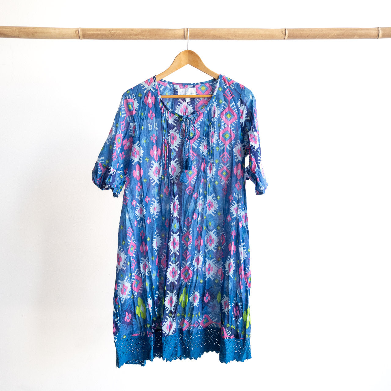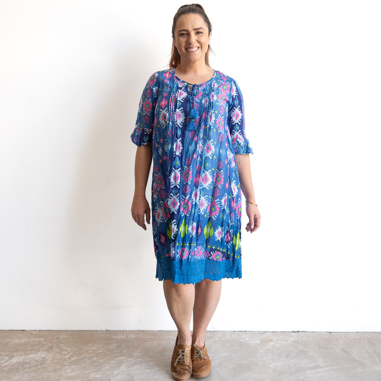 {"id":9968563749150,"title":"Cotton Lace Hem Tunic Dress - Persian Border Blue","handle":"cotton-lace-hem-tunic-dress-persian-border-blue","description":"\u003cp\u003eCut from lightweight crinkled cotton, this tunic silhouette floats gently over the body with plenty of movement and airflow. The round neckline features a soft split with a tie detail, finished with cotton tassels for a touch of texture. Gentle pintucks through the bodice add shape without restriction, keeping the fit relaxed through the waist and hip.\u003c\/p\u003e\n\u003cp\u003eThe sleeves sit just below the elbow for light coverage. The hem falls to just on the knee on most, finished with a decorative cotton lace edge that adds interest and detail. There are no zips, no lining and nothing complicated — just an easy pull-on style designed for warm days.\u003c\/p\u003e\n\u003cp\u003eThe natural crinkle texture means this dress is forgiving, travel-friendly and refreshingly low maintenance.\u003c\/p\u003e\n\u003cp\u003eNicole wears the size 12 in our photos. She is 163cm tall with a bust of 100cm. The fit is relaxed and true to size, with an easy, tunic-style shape.\u003c\/p\u003e\n\u003cp\u003eCold gentle machine wash. No ironing needed - the natural crinkle is part of the charm.\u003c\/p\u003e","published_at":"2026-01-08T15:06:41+10:00","created_at":"2026-01-08T10:08:30+10:00","vendor":"OSR","type":"Women's Dresses","tags":["Category_Dresses","DW23J","flexify","Hannah Tunic Boho Short Sleeve","IMPORT_4","new arrivals","new this week","One Summer SS25\/26","Season_Spring\/Summer","Seasonal 25\/26","spo-cs-disabled","spo-default","spo-disabled","spo-notify-me-disabled","Spring\/Summer 25\/26"],"price":5900,"price_min":5900,"price_max":5900,"available":true,"price_varies":false,"compare_at_price":null,"compare_at_price_min":0,"compare_at_price_max":0,"compare_at_price_varies":false,"variants":[{"id":50494910365982,"title":"10 - Fits bust up to 100cm","option1":"10 - Fits bust up to 100cm","option2":null,"option3":null,"sku":"30540813","requires_shipping":true,"taxable":true,"featured_image":{"id":62733570801950,"product_id":9968563749150,"position":1,"created_at":"2026-01-08T13:16:52+10:00","updated_at":"2026-01-08T13:17:07+10:00","alt":null,"width":1280,"height":1280,"src":"\/\/kobomo.com.au\/cdn\/shop\/files\/CottonLaceEdgeTunicDressbyOneSummer-PersianBorderBlue-2.jpg?v=1767842227","variant_ids":[50494910365982,50494910398750,50494910431518,50494910464286,50494910497054,50494910529822]},"available":true,"name":"Cotton Lace Hem Tunic Dress - Persian Border Blue - 10 - Fits bust up to 100cm","public_title":"10 - Fits bust up to 100cm","options":["10 - Fits bust up to 100cm"],"price":5900,"weight":188,"compare_at_price":null,"inventory_quantity":0,"inventory_management":"shopify","inventory_policy":"continue","barcode":null,"featured_media":{"alt":null,"id":53999841607966,"position":1,"preview_image":{"aspect_ratio":1.0,"height":1280,"width":1280,"src":"\/\/kobomo.com.au\/cdn\/shop\/files\/CottonLaceEdgeTunicDressbyOneSummer-PersianBorderBlue-2.jpg?v=1767842227"}},"requires_selling_plan":false,"selling_plan_allocations":[]},{"id":50494910398750,"title":"12 - Fits bust up to 105cm","option1":"12 - Fits bust up to 105cm","option2":null,"option3":null,"sku":"30540814","requires_shipping":true,"taxable":true,"featured_image":{"id":62733570801950,"product_id":9968563749150,"position":1,"created_at":"2026-01-08T13:16:52+10:00","updated_at":"2026-01-08T13:17:07+10:00","alt":null,"width":1280,"height":1280,"src":"\/\/kobomo.com.au\/cdn\/shop\/files\/CottonLaceEdgeTunicDressbyOneSummer-PersianBorderBlue-2.jpg?v=1767842227","variant_ids":[50494910365982,50494910398750,50494910431518,50494910464286,50494910497054,50494910529822]},"available":true,"name":"Cotton Lace Hem Tunic Dress - Persian Border Blue - 12 - Fits bust up to 105cm","public_title":"12 - Fits bust up to 105cm","options":["12 - Fits bust up to 105cm"],"price":5900,"weight":195,"compare_at_price":null,"inventory_quantity":3,"inventory_management":"shopify","inventory_policy":"continue","barcode":null,"featured_media":{"alt":null,"id":53999841607966,"position":1,"preview_image":{"aspect_ratio":1.0,"height":1280,"width":1280,"src":"\/\/kobomo.com.au\/cdn\/shop\/files\/CottonLaceEdgeTunicDressbyOneSummer-PersianBorderBlue-2.jpg?v=1767842227"}},"requires_selling_plan":false,"selling_plan_allocations":[]},{"id":50494910431518,"title":"14 - Fits bust up to 115cm","option1":"14 - Fits bust up to 115cm","option2":null,"option3":null,"sku":"30540815","requires_shipping":true,"taxable":true,"featured_image":{"id":62733570801950,"product_id":9968563749150,"position":1,"created_at":"2026-01-08T13:16:52+10:00","updated_at":"2026-01-08T13:17:07+10:00","alt":null,"width":1280,"height":1280,"src":"\/\/kobomo.com.au\/cdn\/shop\/files\/CottonLaceEdgeTunicDressbyOneSummer-PersianBorderBlue-2.jpg?v=1767842227","variant_ids":[50494910365982,50494910398750,50494910431518,50494910464286,50494910497054,50494910529822]},"available":true,"name":"Cotton Lace Hem Tunic Dress - Persian Border Blue - 14 - Fits bust up to 115cm","public_title":"14 - Fits bust up to 115cm","options":["14 - Fits bust up to 115cm"],"price":5900,"weight":203,"compare_at_price":null,"inventory_quantity":5,"inventory_management":"shopify","inventory_policy":"continue","barcode":null,"featured_media":{"alt":null,"id":53999841607966,"position":1,"preview_image":{"aspect_ratio":1.0,"height":1280,"width":1280,"src":"\/\/kobomo.com.au\/cdn\/shop\/files\/CottonLaceEdgeTunicDressbyOneSummer-PersianBorderBlue-2.jpg?v=1767842227"}},"requires_selling_plan":false,"selling_plan_allocations":[]},{"id":50494910464286,"title":"16 - Fits bust up to 120cm","option1":"16 - Fits bust up to 120cm","option2":null,"option3":null,"sku":"30540816","requires_shipping":true,"taxable":true,"featured_image":{"id":62733570801950,"product_id":9968563749150,"position":1,"created_at":"2026-01-08T13:16:52+10:00","updated_at":"2026-01-08T13:17:07+10:00","a