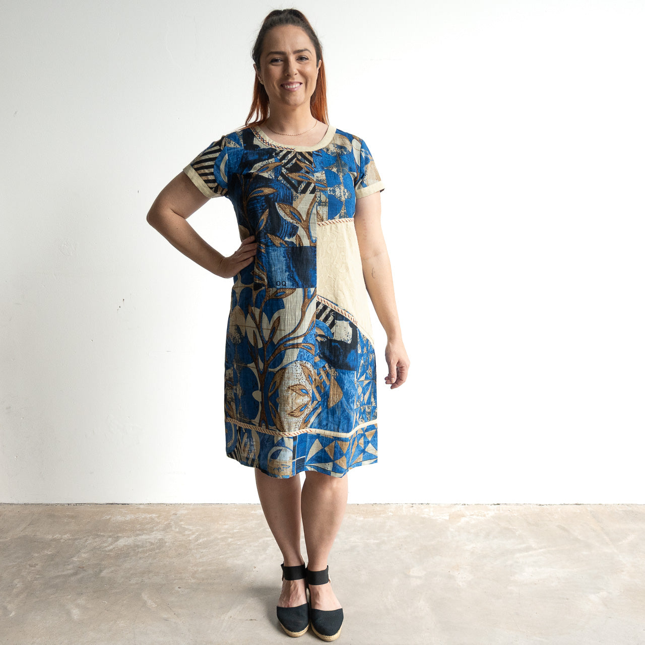 The print is an original composition of deep indigo, sand, and tobacco tones layered with geometric motifs and leaf silhouettes creating a bold yet natural look, like sunlit pattern on clay. Each panel is uniquely placed, giving the dress its handcrafted energy and painterly depth.