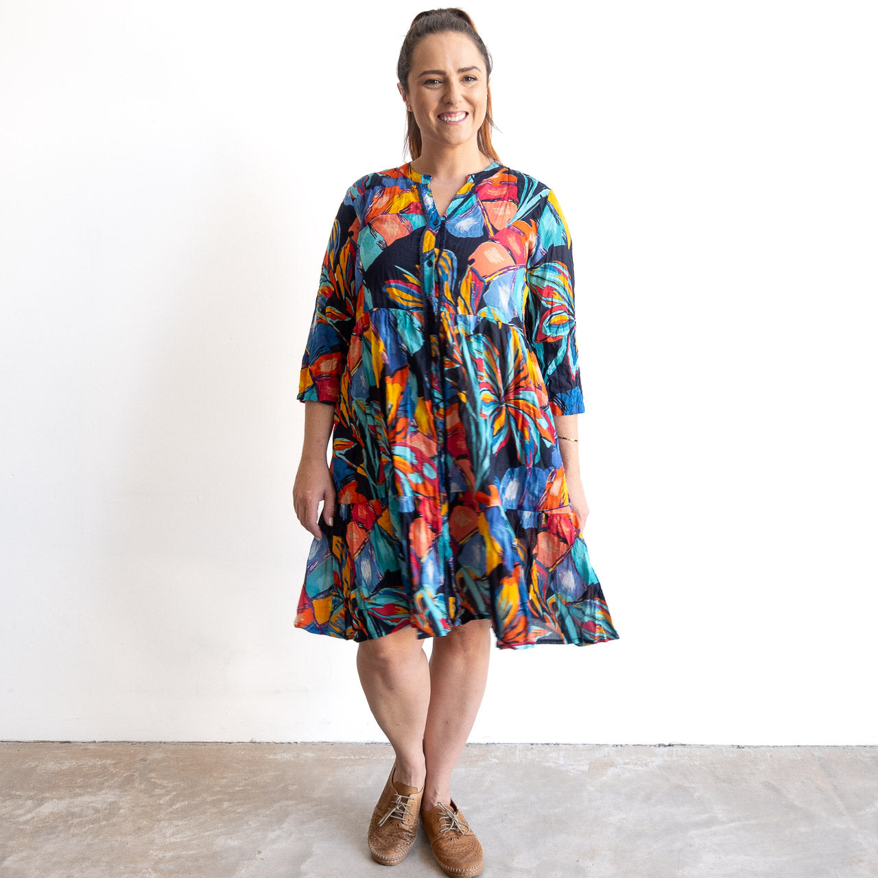 {"id":9967784788254,"title":"Tiered Button-Through Shirt Dress - Tropical Midnight Blue","handle":"tiered-button-through-shirt-dress-tropical-midnight-blue","description":"\u003cp\u003eWonderfully versatile, this full button-through light crinkle cotton style is both a flattering tiered dress and a statement summer throw-over.\u003c\/p\u003e\n\u003cp\u003eThe vibrant tropical print features palm-like foliage in turquoise, coral, sunny yellow and blue against midnight navy. It's eye-catching without being overwhelming.\u003c\/p\u003e\n\u003cp\u003eMade from lightweight cotton that drapes beautifully and breathes in our climate, you'll love the easy twist-and-pack crinkle style, keeping summer as easy as can be.\u003c\/p\u003e\n\u003cp\u003eNicole is wearing the size 12 in our photos. She is 163cm tall with a bust of 100cm. The fit is relaxed and true to size with generous movement through the skirt.\u003c\/p\u003e","published_at":"2026-01-08T13:29:32+10:00","created_at":"2026-01-07T15:11:17+10:00","vendor":"OSR","type":"Women's Dresses","tags":["Category_Dresses","Dress Style 6","DW128J","Festive Frocks","IMPORT_5","new arrivals","new this week","One Summer SS25\/26","Season_Spring\/Summer","spo-cs-disabled","spo-default","spo-enabled","spo-notify-me-disabled","Spring\/Summer 25\/26","TigerLily Green","Vivian V Neck Shirt Dress"],"price":6900,"price_min":6900,"price_max":6900,"available":true,"price_varies":false,"compare_at_price":null,"compare_at_price_min":0,"compare_at_price_max":0,"compare_at_price_varies":false,"variants":[{"id":50493214130462,"title":"10 - Fits bust up to 100cm","option1":"10 - Fits bust up to 100cm","option2":null,"option3":null,"sku":"30537667","requires_shipping":true,"taxable":true,"featured_image":{"id":62732884967710,"product_id":9967784788254,"position":1,"created_at":"2026-01-08T13:04:16+10:00","updated_at":"2026-01-08T13:04:31+10:00","alt":null,"width":1280,"height":1280,"src":"\/\/kobomo.com.au\/cdn\/shop\/files\/Tiered_Button-Through_Shirt_Dress_by_One_Summer_-_Tropical_Midnight_Blue-11.jpg?v=1767841471","variant_ids":[50493214130462,50493214163230,50493214195998,50493214228766,50493214261534,50493214294302]},"available":true,"name":"Tiered Button-Through Shirt Dress - Tropical Midnight Blue - 10 - Fits bust up to 100cm","public_title":"10 - Fits bust up to 100cm","options":["10 - Fits bust up to 100cm"],"price":6900,"weight":180,"compare_at_price":null,"inventory_quantity":0,"inventory_management":"shopify","inventory_policy":"continue","barcode":null,"featured_media":{"alt":null,"id":53999157641502,"position":1,"preview_image":{"aspect_ratio":1.0,"height":1280,"width":1280,"src":"\/\/kobomo.com.au\/cdn\/shop\/files\/Tiered_Button-Through_Shirt_Dress_by_One_Summer_-_Tropical_Midnight_Blue-11.jpg?v=1767841471"}},"requires_selling_plan":false,"selling_plan_allocations":[]},{"id":50493214163230,"title":"12 - Fits bust up to 105cm","option1":"12 - Fits bust up to 105cm","option2":null,"option3":null,"sku":"30537668","requires_shipping":true,"taxable":true,"featured_image":{"id":62732884967710,"product_id":9967784788254,"position":1,"created_at":"2026-01-08T13:04:16+10:00","updated_at":"2026-01-08T13:04:31+10:00","alt":null,"width":1280,"height":1280,"src":"\/\/kobomo.com.au\/cdn\/shop\/files\/Tiered_Button-Through_Shirt_Dress_by_One_Summer_-_Tropical_Midnight_Blue-11.jpg?v=1767841471","variant_ids":[50493214130462,50493214163230,50493214195998,50493214228766,50493214261534,50493214294302]},"available":true,"name":"Tiered Button-Through Shirt Dress - Tropical Midnight Blue - 12 - Fits bust up to 105cm","public_title":"12 - Fits bust up to 105cm","options":["12 - Fits bust up to 105cm"],"price":6900,"weight":185,"compare_at_price":null,"inventory_quantity":3,"inventory_management":"shopify","inventory_policy":"continue","barcode":null,"featured_media":{"alt":null,"id":53999157641502,"position":1,"preview_image":{"aspect_ratio":1.0,"height":1280,"width":1280,"src":"\/\/kobomo.com.au\/cdn\/shop\/files\/Tiered_Button-Through_Shirt_Dress_by_One_Summer_-_Tropical_Midnight_Blue-11.jpg?v=1767841471"}},"requires_selling_plan":false,"selling_plan_allocations":[]},{"id":50493214195998,"title":"14 - Fits bust up to 110cm","option1":"14 - Fits bust up to 110cm","option2":null,"option3":null,"sku":"30537669","requires_shipping":true,"taxable":true,"featured_image":{"id":62732884967710,"product_id":9967784788254,"position":1,"created_at":"2026-01-08T13:04:16+10:00","updated_at":"2026-01-08T13:04:31+10:00","alt":null,"width":1280,"height":1280,"src":"\/\/kobomo.com.au\/cdn\/shop\/files\/Tiered_Button-Through_Shirt_Dress_by_One_Summer_-_Tropical_Midnight_Blue-11.jpg?v=1767841471","variant_ids":[50493214130462,50493214163230,50493214195998,50493214228766,50493214261534,50493214294302]},"available":true,"name":"Tiered Button-Through Shirt Dress - Tropical Midnight Blue - 14 - Fits bust up to 110cm","public_title":"14 - Fits bust up to 110cm","options":["14 - Fits bust up to 110cm"],"price":6900,"weight":187,"compare_at_price":null,"inventory_quantity":2,"inventory_management":"shopify","inventory_policy":"continue","barcode":null,"featured_media":{"alt":null,"id":53999157641502,"position":1,"preview_image":{"aspect_ratio":1.0,"height":1280,"width":1280,"src":"\/\/kobomo.com.au\/cdn\/shop\/files\/Tiered_Button-Through_Shirt_Dress_by_One_Summer_-_Tropical_Midnight_Blue-11.jpg?v=1767841471"}},"requires_selling_plan":false,"selling_plan_allocations":[]},{"id":50493214228766,"title":"16 - Fits bust up to 115cm","option1":"16 - Fits bust up to 115cm","option2":null,"option3":null,"sku":"30537670","requires_shipping":true,"taxable":true,"featured_image":{"id":62732884967710,"product_id":9967784788254,"position":1,"created_at":"2026-01-08T13:04:16+10:00","updated_at":"2026-01-08T13:04:31+10:00","alt":null,"width":1280,"height":1280,"src":"\/\/kobomo.com.au\/cdn\/shop\/files\/Tiered_Button-Through_Shirt_Dress_by_One_Summer_-_Tropical_Midnight_Blue-11.jpg?v=1767841471","variant_ids":[50