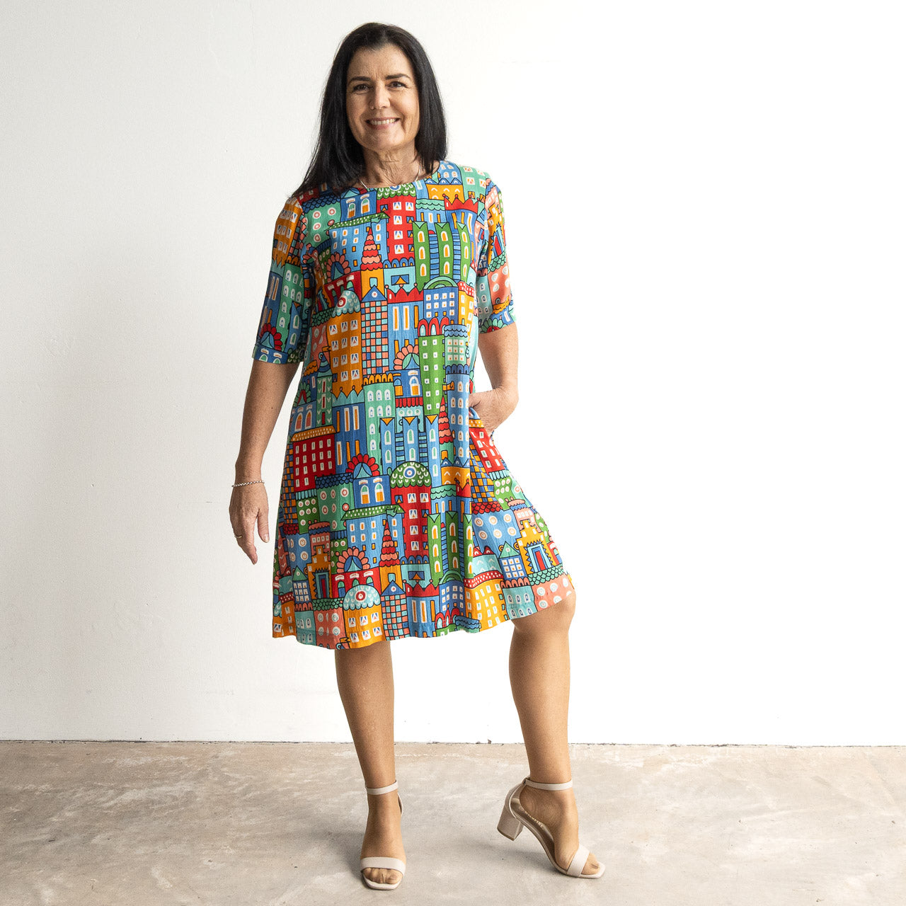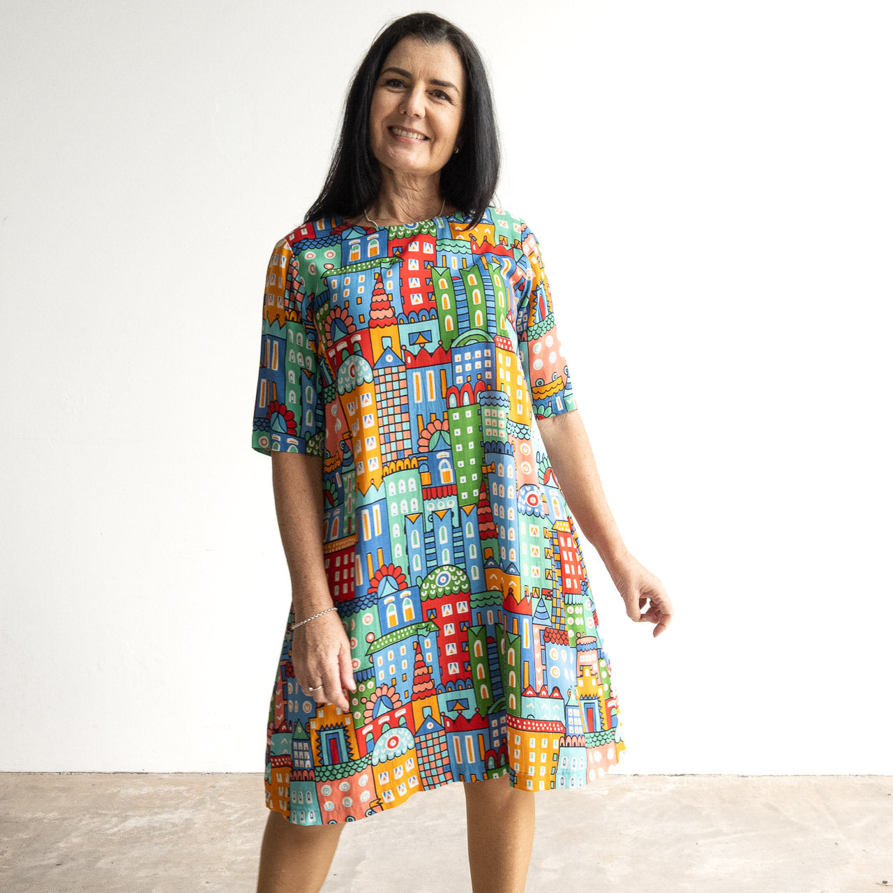 Made from premium rayon, the fabric is soft, breathable and smooth to the touch, draping beautifully over the body. The silhouette is simple and modern in a classic shift shape with a round neckline, elbow-length sleeves and straight lines that fall comfortably through the body. Side seam pockets are sewn in, and the hem finishes just on the knee for an easy, flattering length.